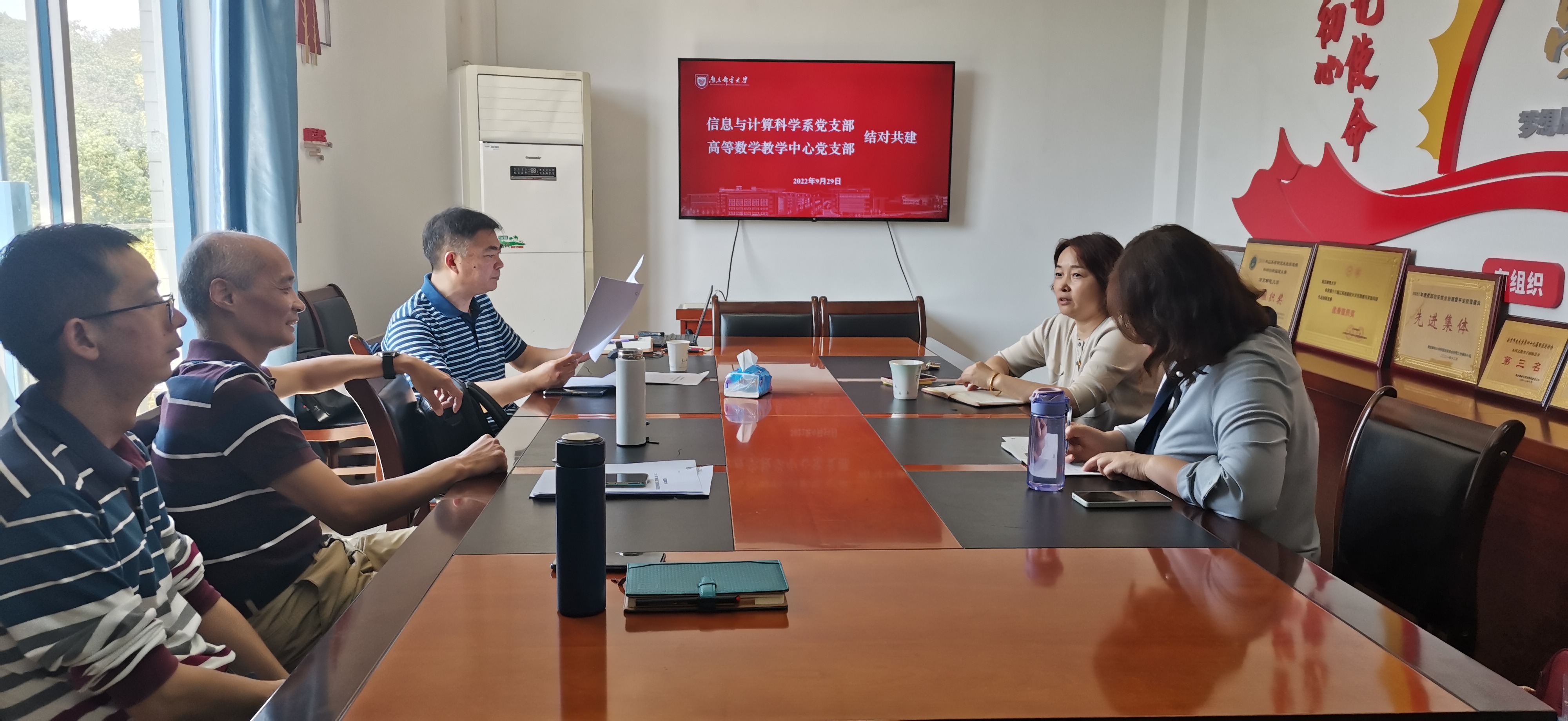 学院党委于9月29日下午在教二324召集“全国党建工作样板党支部”——信息与计算科学系党支部和高等数学教学中心支部开展共建活动,院党委书记尹志丽、分管教学的副院长刘胜利、校“教学卓越奖”获得者邱中华教授、信息与计算科学系党支部书记戴建新老师、高等数学教学中心党支部书记宋洪雪老师参加了此次共建活动。会上戴建新书记就如何以党建来引领系中心快速发展做了经验分享。与会人员为高等数学教学中心的党建和课程建设工作把脉定向,从党建、教学、科研三个维度提出了战略发展构想和团队建设的结构性方案。