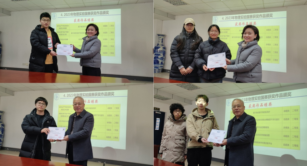 在会议第一环节,何学敏详细介绍了2023年度物理竞赛相关工作开展情况以及我校参赛获奖情况,使参会师生对物理竞赛有了一个全面的了解。对我校学子在2023年物理实验国赛中的优异表现,新葡萄8883国际官网高丽副院长和唐加山院长先后给获奖学生代表颁发获奖证书,以示肯定和褒奖。