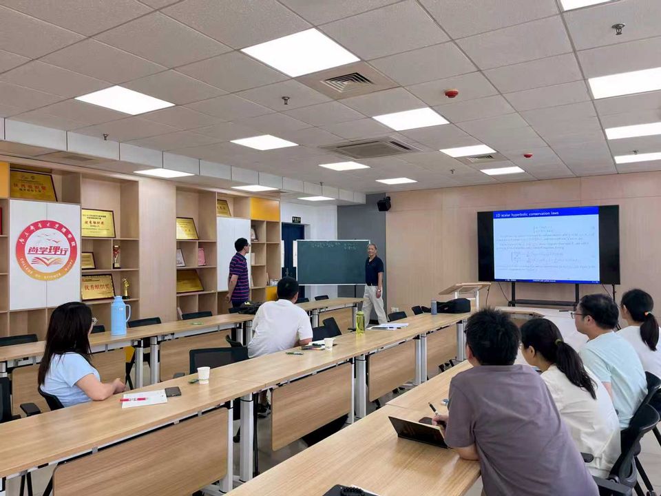 互动交流环节,师生就非线性权函数设计、多维推广、工程应用前景等问题与邱教授展开热烈讨论。邱教授结合自己多年从事高精度格式的研究经验,鼓励青年学者“从问题出发、从简洁入手”,在算法设计与理论分析之间形成闭环,持续推动计算数学服务国家重大需求。