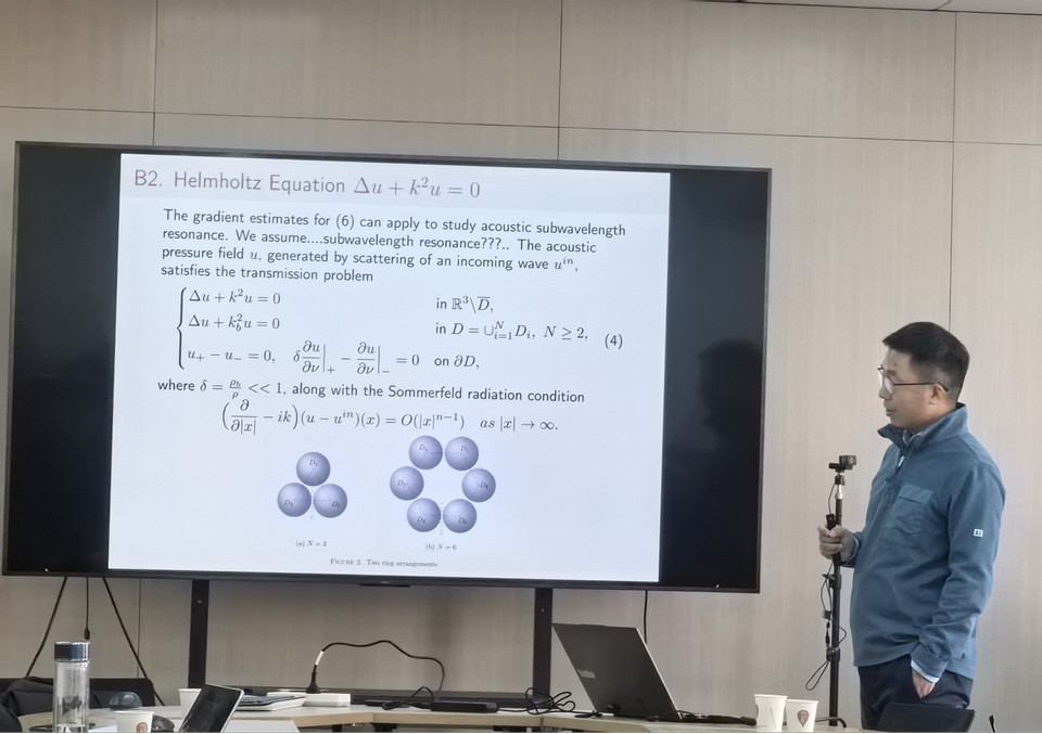 报告围绕当两个刚性夹杂在弹性材料或Stokes流体中间距趋近于零时出现的应力集中现象展开。李教授指出,当夹杂间的距离极小,解在窄缝区域呈现显著奇异性,对理论分析与数值模拟均带来挑战。为准确刻画该类问题的力学与数学特征,获得相关方程解的高阶导数估计是关键。李教授系统介绍了团队在电导率模型、Lamé系统、Stokes系统以及悬浮体系力学中的研究进展,并从模型背景、奇异性来源、梯度估计、高阶导数理论与数值分析等方面给出了深入阐释。李教授还展示了研究团队使用凸积分方法处理Stokes方程不可压缩条件的技术路线,并详细介绍了研究工作的主要内容与技术架构。