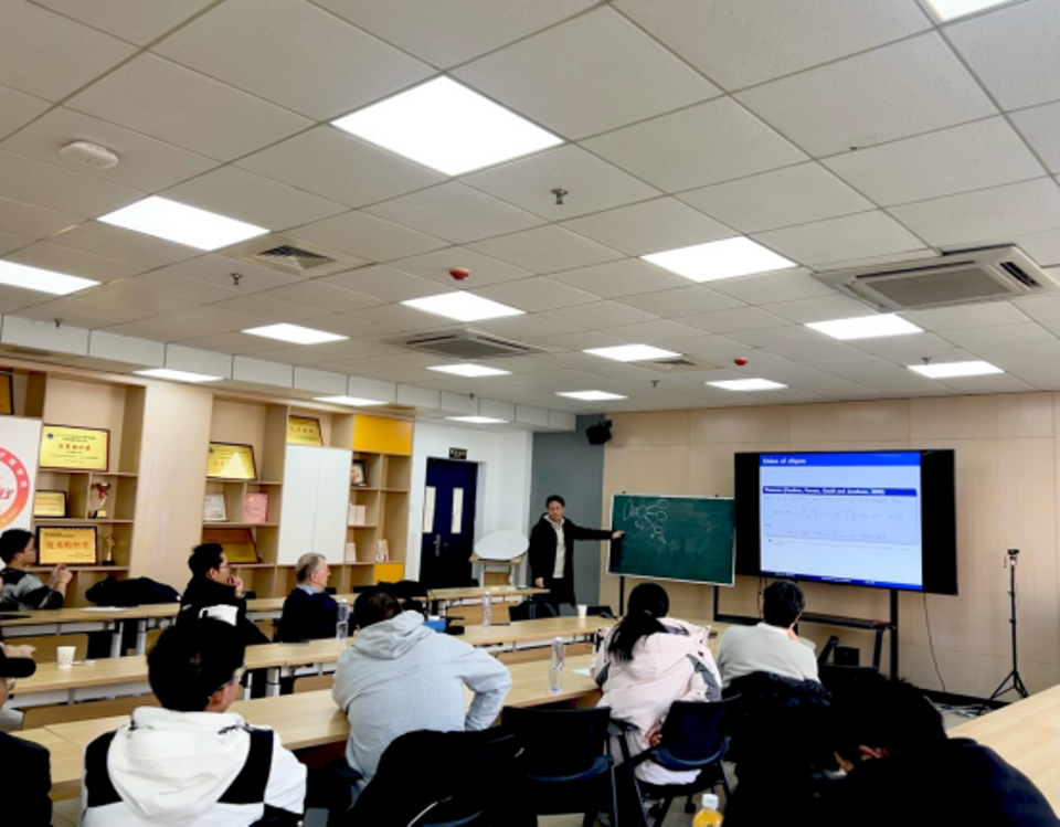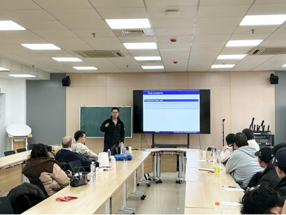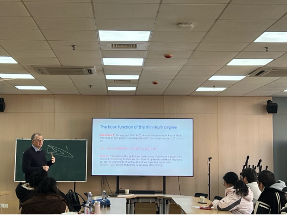Győri教授是国际著名的极值图论专家,曾获得匈牙利科学院奖,成果丰硕。Győri教授介绍了1995年他与Erdős、Faudree合作的重要工作:与极值图论中经典的“图书”(Book)概念(由k个三角形共享一条公共边(书脊)所构成的特殊图结构)相关的重要结论。对于满足最小度δ(G) ≥ cn(其中1/2 < c < 1)的n个顶点图,他们证明了图中必然包含较大的图书,并对部分c值确定了能保证存在的最大图书页数b(c)。Győri教授将焦点转向了函数b(c)在所有c∈(0,1)上的完整行为。他介绍了一个基于有理数乘积表示的新猜想。该猜想如果成立,将揭示b(c)具有极为奇特的性质:它虽然是关于c的单调递增函数,却在每一个有理数处发生跳跃。这种“在每个有理数处跳跃”的函数行为在分析学中极为罕见,展示了极值图论问题与数论之间深刻而美妙的联系。